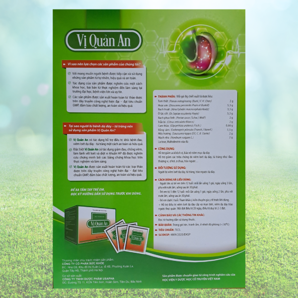 Vị Quản An là thực phẩm bảo vệ sức khỏe giúp hỗ trợ giảm triệu chứng đau dạ dày, viêm loét dạ dày tá tràng, trào ngược dạ dày thực quản. Với thành phần từ thảo dược thiên nhiên, sản phẩm hỗ trợ bảo vệ niêm mạc dạ dày, giúp duy trì sức khỏe hệ tiêu hóa.